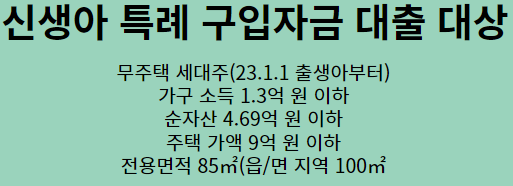 대출 신청일 기준 2년내 출산한 무주택 세대주(23. 1.1 출생아부터)로서 가구 소득 1.3억 원 이하, 순자산 4.69억 원 이하여야 하고 주택 가액이 9억 원 이하, 전용면적 85㎡이하이고 읍/면 지역에 한하여 100㎡이어야 합니다.