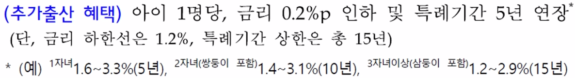아이 1명당 , 금리 0.2%p 인하 및 특례기간 5년 연장해줍니다. 그래서 10년까지 적용을 받을 수 있습니다, 단 우대 금리 하한선은 1.2%이며 특례기간 상한도 총 15년까지 입니다.