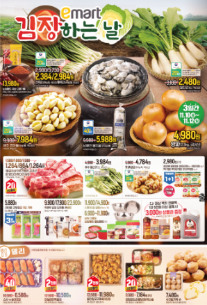 김장할 때 필요한 마늘과 무, 양파, 굴, 수육 삶을 고기와 과일 등도 할인을 합니다. 그리고 축산에서는 신세계 포인트 적립시에 40% 할인을 해주고 수산과, 가공식품도 할인이 들어 갑니다.