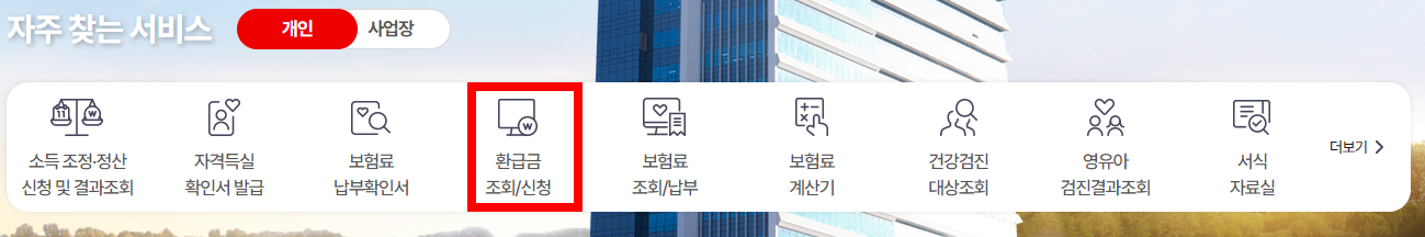 - 환급금 조회/신청 버튼 클릭: 홈페이지에서 ‘환급금 조회/신청’ 버튼을 클릭합니다. 아래 이미지를 참고하면 도움이 됩니다.