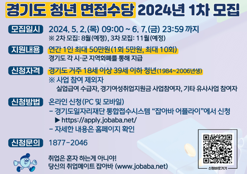 안녕하세요, 청년 여러분! 새로운 기회가 여러분을 기다리고 있습니다. 경기도와 경기도일자리재단이 함께하는 '2024년 청년면접수당 1차 모집'이 시작됩니다. 이번 기회를 통해 꿈을 키우고 미래에 한 발짝 다가가는 기회를 잡아보세요.