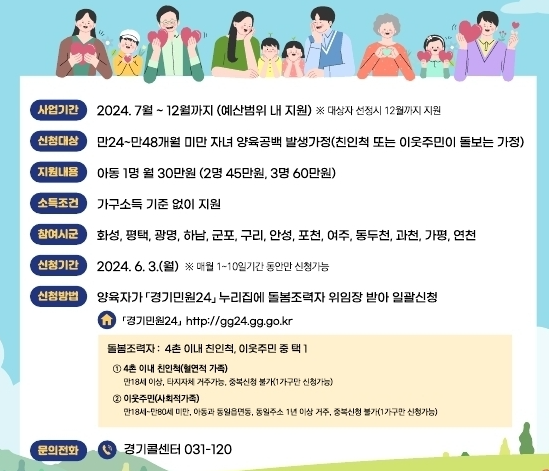 - 생후 24~48개월 미만의 아동: 지원 대상은 경기도에 거주하는 생후 24~48개월 미만의 아동입니다. 이 아동들은 아직 어린 연령으로 보호자의 돌봄이 필요합니다.