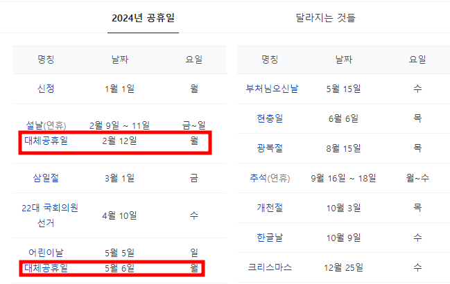 2024년 대체공휴일은설연휴인 2월 12일 월요일과 어린이날 대체공휴일 5월 6일 월요일이 있습니다.