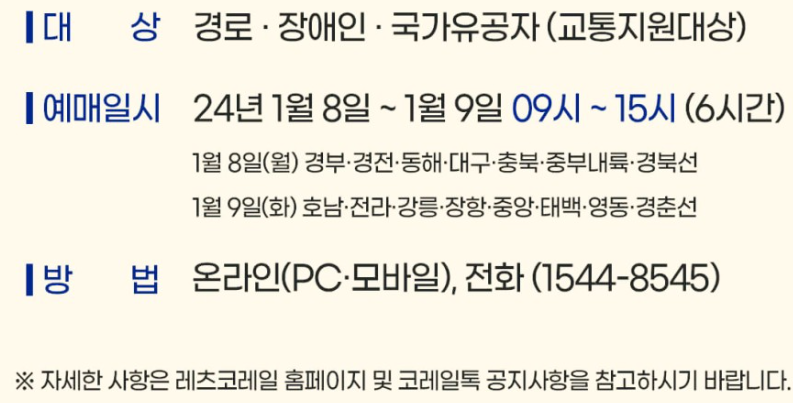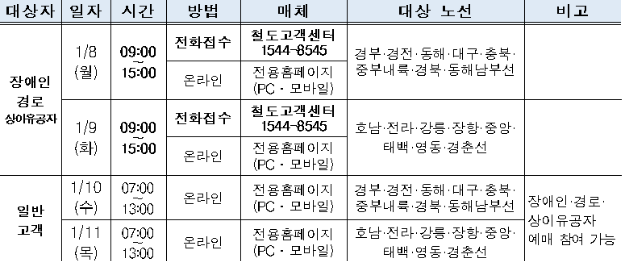 교통약자 우선 예매 일정 : 1월 15일(월) - 경부·경전·동해선, 1월 16일(화) - 호남·전라선