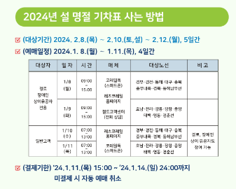 2024년 설 명정이 벌써 한달 앞으로 다가왔습니다. 설 명절이 다가오면서 많은 분들이 고향이나 가족을 찾아 떠나기 위해 이동 계획을 세우고 계실 것입니다. 이에 따라 설 명절 승차권 예매에 대한 정보가 중요해지고 있습니다. 이 블로그 글에서는 설 명절 승차권 예매 일정과 예매에 필요한 정보를 구체적으로 안내해 드리겠습니다.