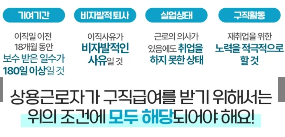 - 고용보험 가입 기간: 퇴사 전 180일 이상 고용보험에 가입되어 있어야 합니다.