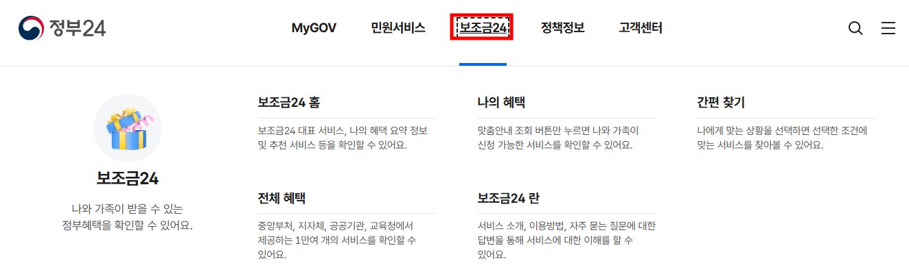 - 상단 메뉴에서 ‘보조금24’ 클릭