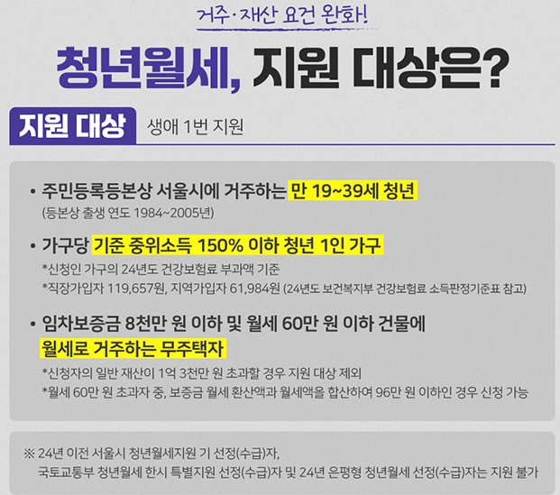 - 국민기초생활수급자, 청년월세(시·정부) 기수혜자, 2024년 은평형 청년월세 선정자, 서울시 청년수당을 받는 경우에도 신청할 수 없습니다.