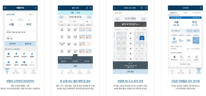 - 예매 가능한 열차: KTX, ITX, 새마을호, 무궁화호, SRT 등 주요 열차의 기차표를 예매할 수 있습니다. 각 열차의 시간표와 요금 정보를 확인한 후 원하는 기차를 선택하세요.