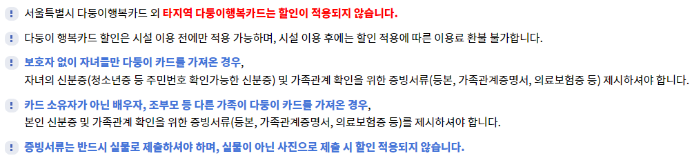 - 증빙서류 제시: 실물카드(또는 앱카드)와 함께 가족 관계를 확인할 수 있는 증빙서류(등본, 가족관계증명서, 의료보험증 등)를 제시해야 합니다.