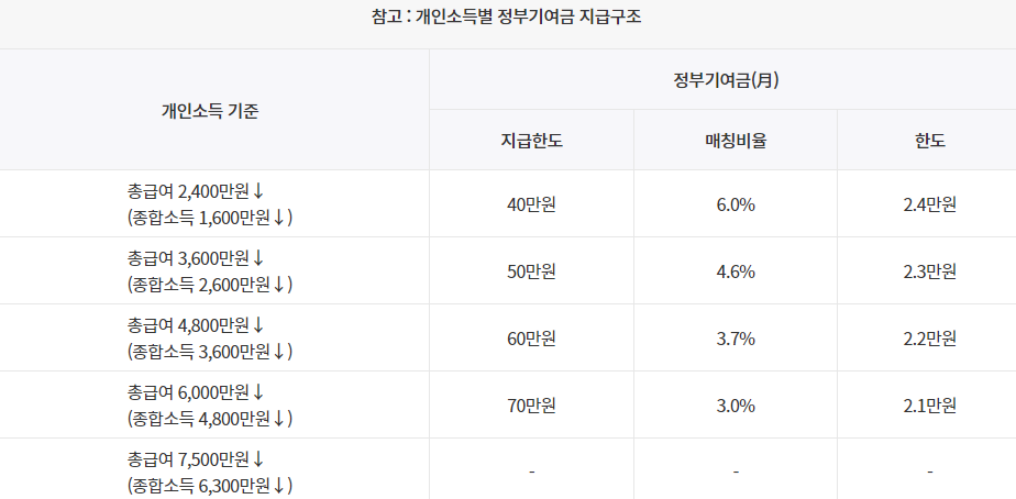 청년도약계좌 개인소득별 정부기여금 지급구조