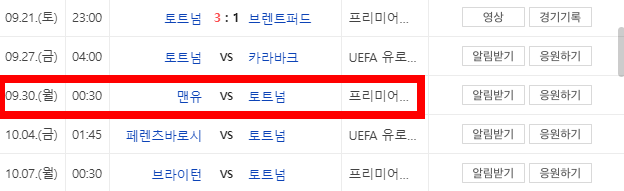 - 토트넘 홋스퍼 FC와 맨체스터 유나이티드 FC의 EPL 6라운드 경기는 한국 시간으로 9월 30일 밤 11시에 시작될 예정입니다. 팬들에게 최고의 시간대는 아니지만, 프리미어리그 빅매치답게 늦은 시간에도 많은 팬들이 실시간으로 경기를 지켜볼 것으로 보입니다.