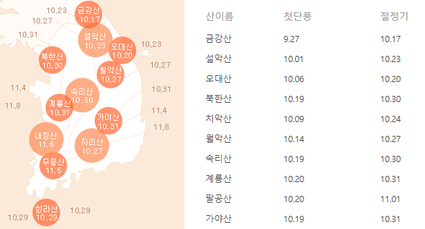 • 첫 단풍 예상일: 10월 초