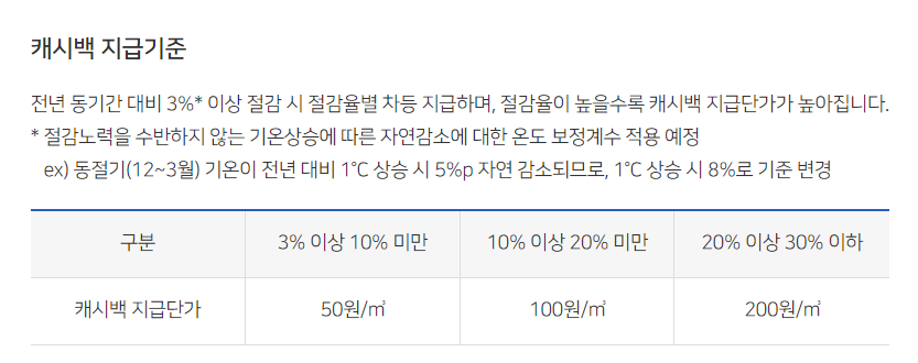- ㎥당 100원 적용 → 6,000원 캐시백 지급