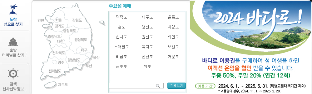 • 2024년 ‘바다로’ 티켓을 구매하면, 올해 6월 1일부터 2025년 5월 31일까지 연간 12회 이내로 15개 선사가 운영하는 39개 항로, 48척의 여객선을 최대 50% 할인된 운임으로 이용할 수 있습니다.