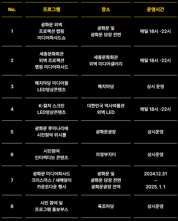 - 광화문 광장을 중심으로 한 가족 단위의 체험 프로그램, 실시간 라이브 공연, 연말을 맞이한 특별 퍼포먼스 등이 계획되어 있어 모든 연령층이 즐길 수 있는 축제가 될 것입니다.