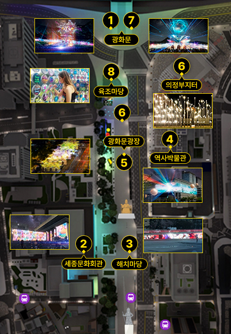 - 광화문은 한국의 역사와 문화의 중심지로, 이번 축제에서는 이곳을 배경으로 한 웅장한 미디어아트 쇼가 진행됩니다. 광화문의 역사적 배경을 살려, 빛을 통해 서울의 과거와 현재, 그리고 미래를 다채롭게 표현합니다.