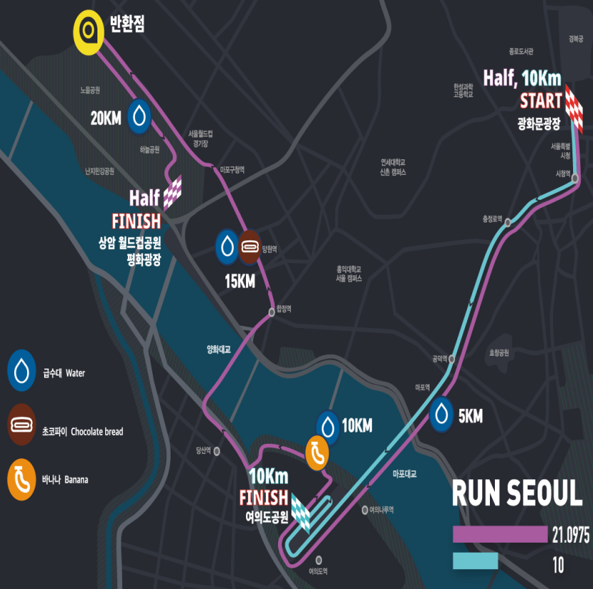 10km : 광화문 광장 출발 - 서울특별시청 - 시청역- 충정로역 - 공뎍역 - 여의도공원 도착