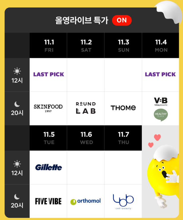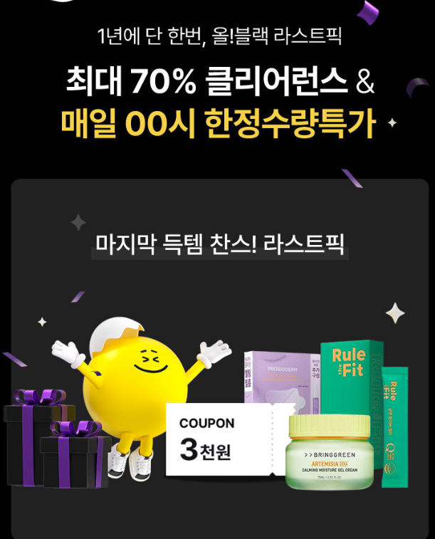 일주일 동안 특정 카테고리 제품을 최대 60% 할인된 가격에 한정 판매합니다. 보습템, 해외직구템, 메이크업 제품 등 계절성 상품과 한정판 제품이 포함되어 있으며, 매년 소비자들의 큰 관심을 받는 인기 이벤트입니다.