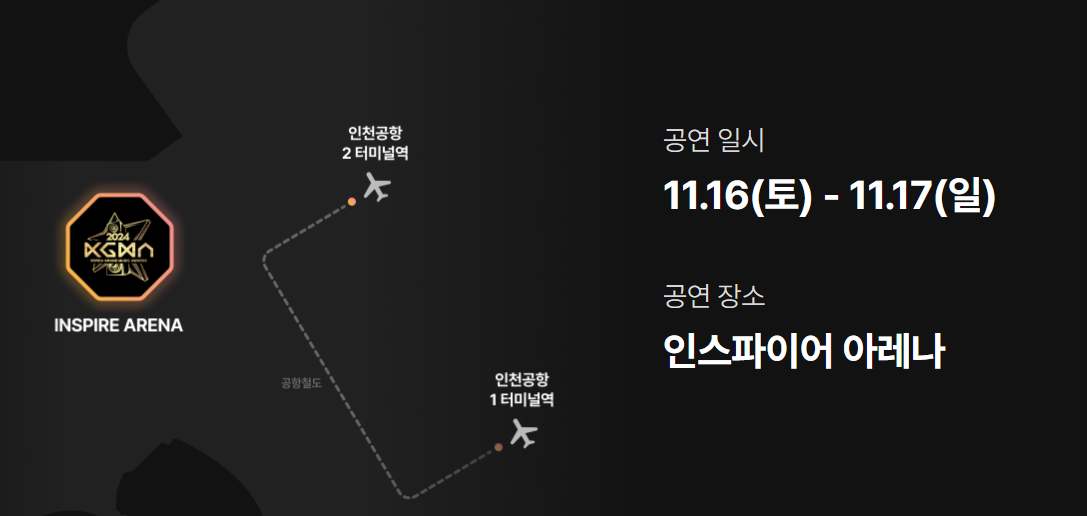 - 2024년 코리아 그랜드 뮤직 어워즈는 11월 16일(토)과 17일(일), 두 차례에 걸쳐 인천 영종도에 위치한 인스파이어 아레나에서 열립니다. 각 공연은 저녁 7시에 시작하며, 인스파이어 아레나는 최대 15,000명 이상을 수용할 수 있는 최신 복합 공연장입니다.