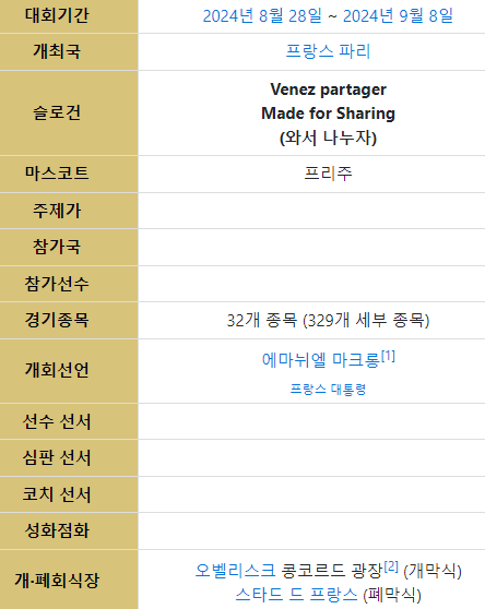 - 올림픽 대회 기간: 2024년 7월 26일(금) - 8월 11일(일)