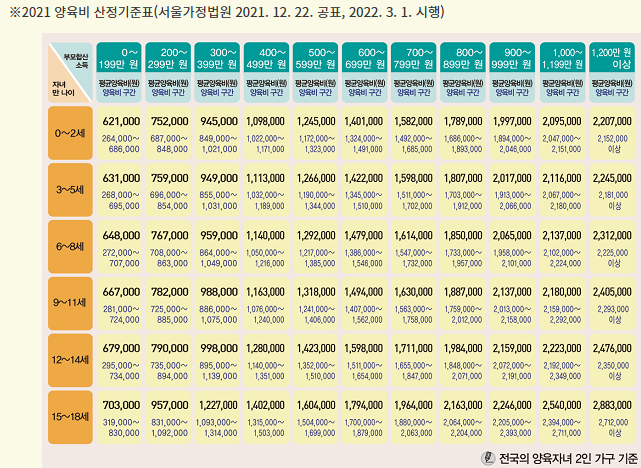 3. 2021년 양육비 산정 기준표 주요 내용
