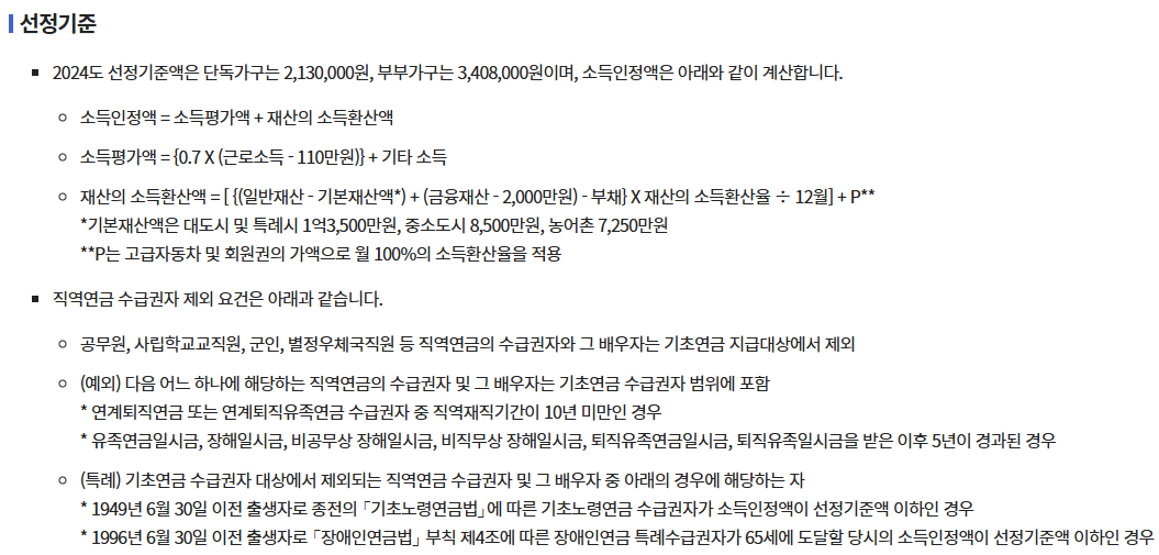 - 노인 단독가구 또는 부부가구의 소득과 재산을 기준으로 지급 여부가 결정되며, 국민연금 가입 여부 및 수급액에 따라 지급액이 조정될 수도 있습니다.