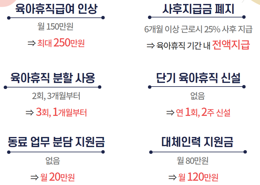 - 이는 부모님들이 더 이상 복직 후 지급될 급여를 걱정하지 않고, 육아휴직 기간 동안 안정적인 급여를 받을 수 있다는 점에서 큰 개선이라고 할 수 있습니다.