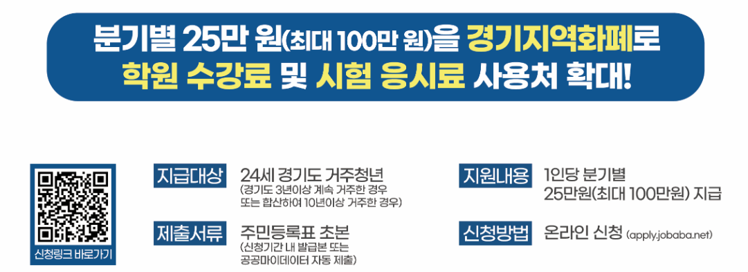 만 24세이고 경기도에 요건대로 거주해왔다면, 이 제도는 놓치기 아까운 기회입니다: 신청 절차가 복잡하지 않고, 사용할 수 있는 범위 또한 생활에 밀접한 곳이 많습니다. 특히 학원비, 자격증 시험 응시료, 동네 식당·카페, 병원 등 ‘일상 속 필요한 지출’을 커버할 수 있어 부담이 한결 가벼워질 수 있습니다.