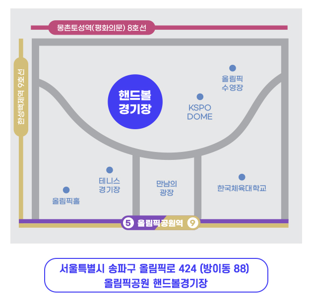 특히 서울 올림픽공원 핸드볼경기장은 대중교통 접근성이 좋아서 지하철 및 버스를 이용하는 것이 편리합니다.