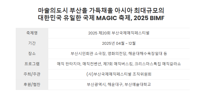 부산국제매직페스티벌은 단순한 마술 공연을 넘어, 삶의 활력과 감동을 선사하는 예술 축제입니다. 2025년 BIMF는 가족의 웃음, 친구와의 추억, 연인과의 특별한 순간을 만들어 줄 마법 같은 시간으로 가득할 예정입니다.