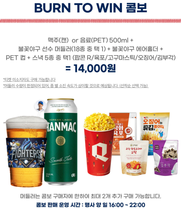 - BURN TO WIN 콤보: 캔맥주(또는 음료) + 스낵 + 전용 머들러 + 컵홀더 구성