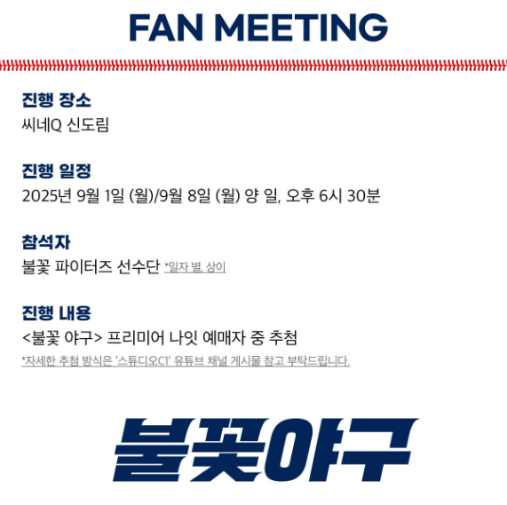 2025년 9월 신도림 씨네Q에서 열리는 불꽃야구 프리미어 상영 이벤트는 단순히 영상을 보는 자리가 아니라, 대형 스크린과 극장 사운드로 느끼는 야구의 현장감, 선수들과의 만남, 팬사인회와 굿즈 혜택까지 결합된 특별한 경험입니다.