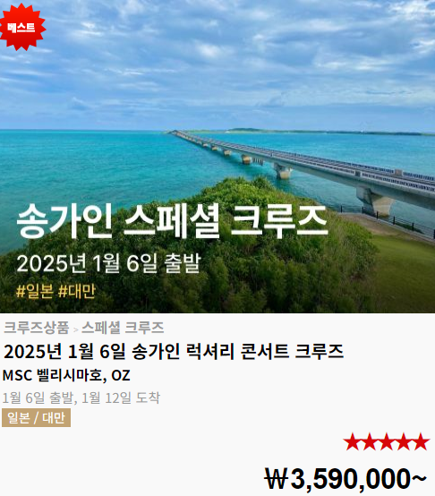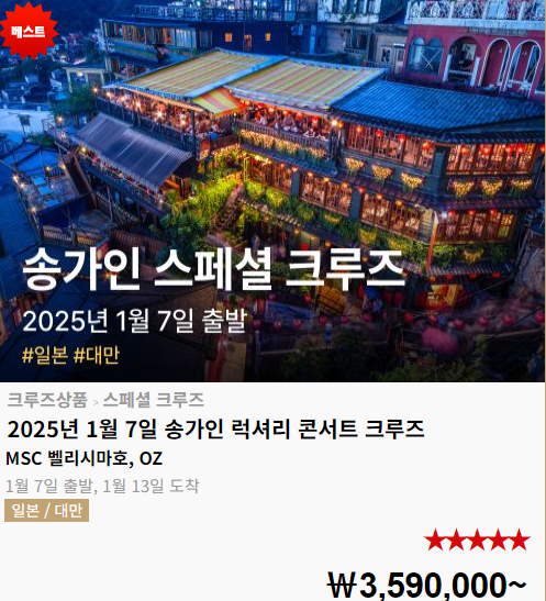 - 송가인 크루즈 콘서트는 단순한 공연 이상의 특별한 경험을 선사합니다. 크루즈라는 공간 자체가 독특한 여행 경험을 제공하며, 선상에서의 라이브 공연은 일반적인 공연장에서는 느낄 수 없는 색다른 감동을 줍니다. 푸른 바다 위에서 펼쳐지는 송가인의 목소리는 한층 더 깊은 감동을 전달할 것입니다.