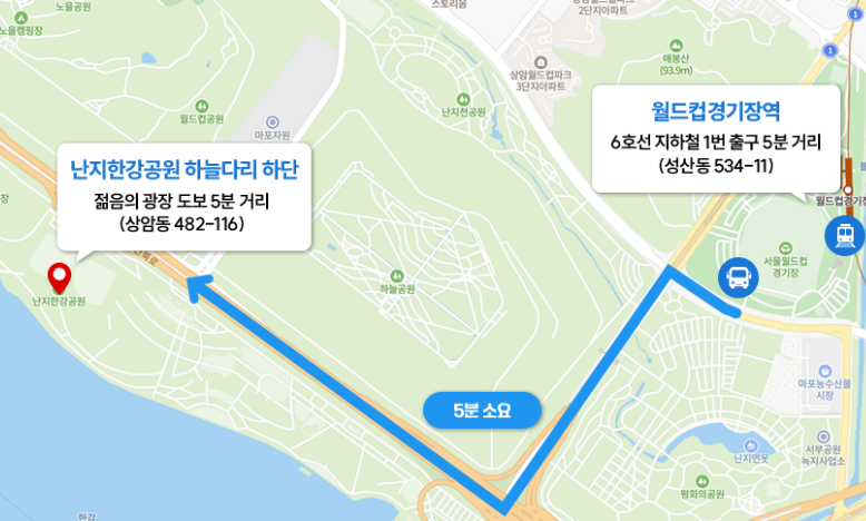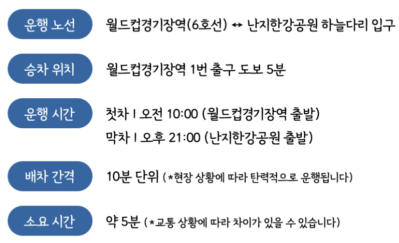 - 셔틀버스 운행: 6호선 월드컵경기장역 ↔ 난지한강공원 하늘다리입구