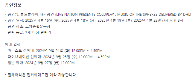 - 공연명: 콜드플레이 내한공연 (LIVE NATION PRESENTS COLDPLAY: MUSIC OF THE SPHERES DELIVERED BY DHL)