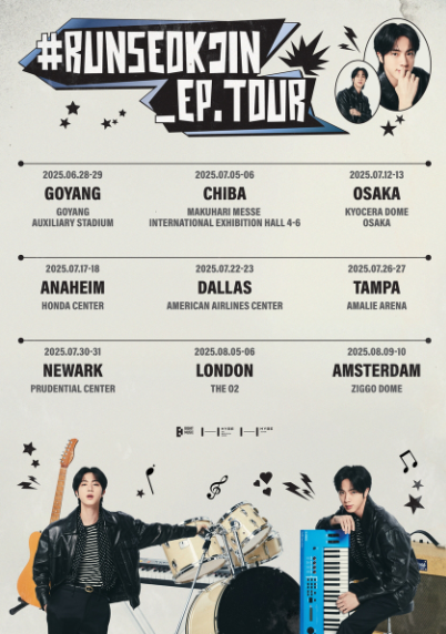 'RUNSEOKJIN_EP.TOUR'는 BTS 진의 자체 예능 콘텐츠 **‘달려라 석진’**을 모티브로 한 스핀오프 콘셉트의 팬콘서트입니다. 단순한 아이돌 무대가 아닌, 진의 음악적 색채와 밴드 사운드 중심의 공연으로, 더욱 깊이 있는 공연이 기대됩니다.