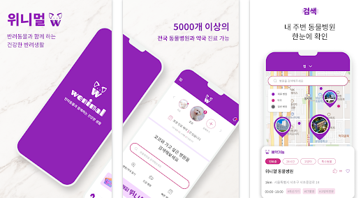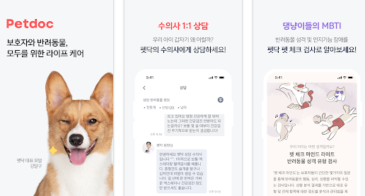 - 주요 기능: 실시간 상담, 24시 동물병원 검색, 반려동물 관리 일지, 반려동물 전용 쇼핑공간