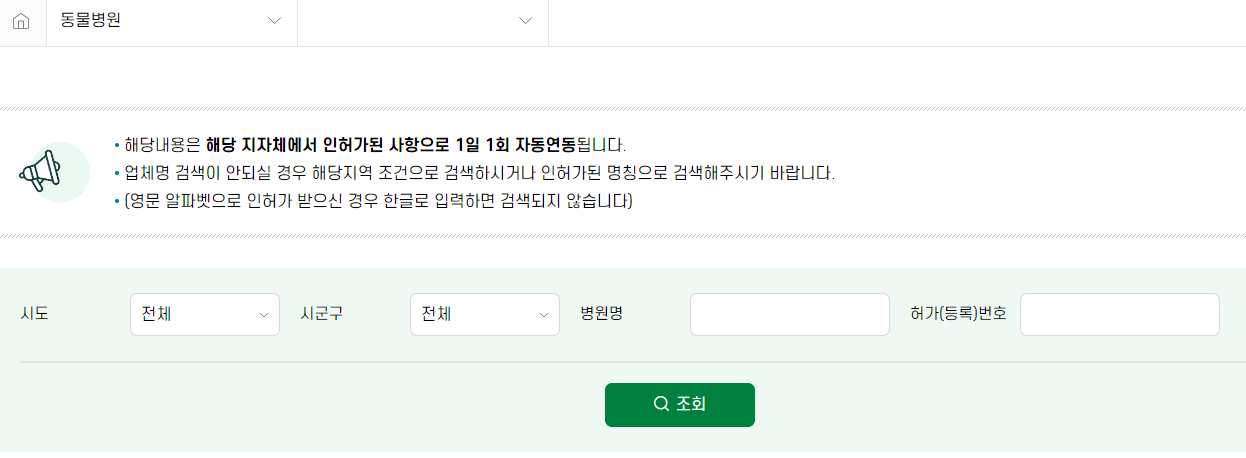- 메뉴에서 업체정보를 클릭한 후 동물병원을 선택합니다.