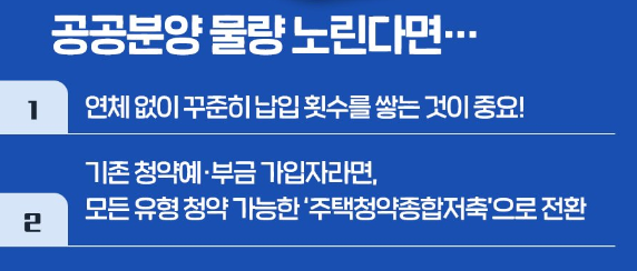 - 청약통장에 매월 꾸준히 납입하는 것이 중요합니다. 특히 경제적 부담이 되지 않는다면, 월 25만원씩 미납 없이 꾸준히 납입하는 것이 좋습니다. 납입 기간과 횟수가 모두 중요한 청약통장에서, 연체 없이 꾸준히 납입하여 회차를 많이 쌓는 것이 당첨 가능성을 높이는 핵심입니다.