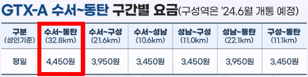 - 현재 동탄에서 수서까지는 SRT를 이용하면 20분 정도면 도착할 수 있습니다. 그러나 SRT의 요금은 편도로 약 7400원 정도로 매일 출퇴근에는 부담이 되는 수준입니다. 이와는 달리 GTX-A 노선을 이용하면 동탄에서 수서까지 4450원으로, 동일한 시간에 도착할 수 있습니다. 더불어, 삼성역이 미개통이라도 환승 할인이 적용되기 때문에 서울로 출퇴근하는 분들에게는 매력적인 선택지입니다.