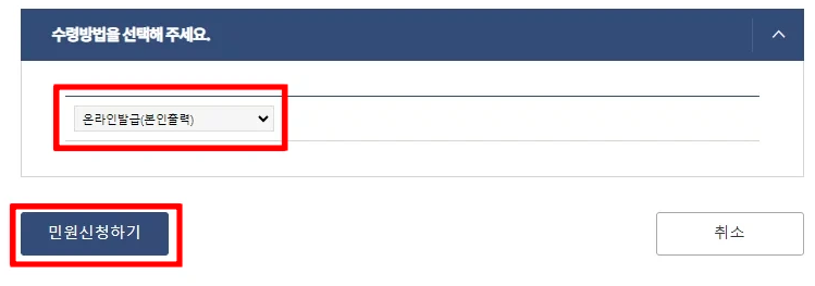 - 서류를 어떻게 수령할지 방법을 선택합니다. 직접 출력하거나 이메일로 받을 수 있습니다. 이후 "민원 신청하기" 버튼을 눌러 신청을 완료합니다.