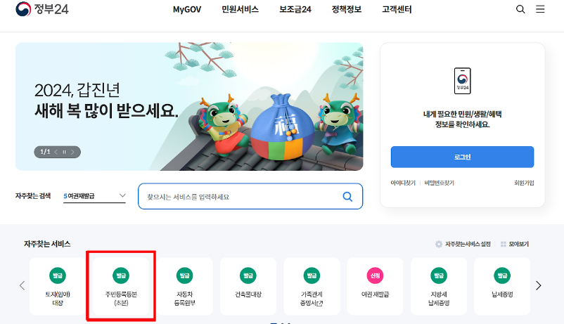 - 사이트 내에서 "주민등록등본" 또는 "주민등록초본" 메뉴를 클릭합니다. 이 메뉴는 쉽게 찾을 수 있도록 상단 메뉴나 메인 페이지에 배치되어 있습니다.