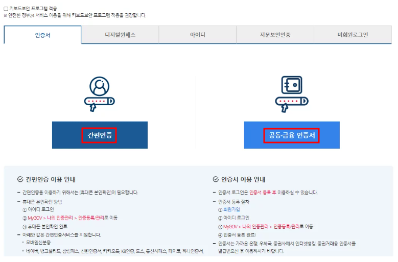 - 원하는 방법으로 인증 및 로그인을 진행합니다. 공동인증서, 간편인증(네이버, 카카오, 패스 등)을 이용하여 본인 인증을 완료합니다.