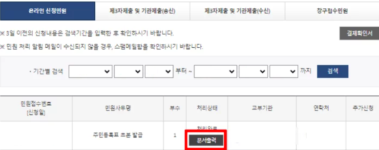 - 서류를 어떻게 수령할지 방법을 선택합니다. 직접 출력하거나 이메일로 받을 수 있습니다. 이후 "민원 신청하기" 버튼을 눌러 신청을 완료합니다.