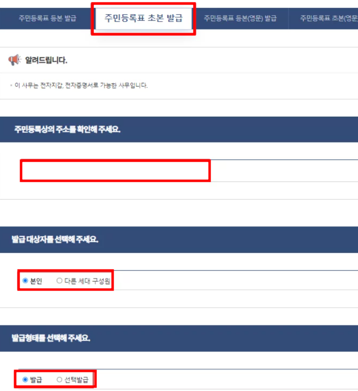 주민등록초본 발급 선택 및 세부내용 설정